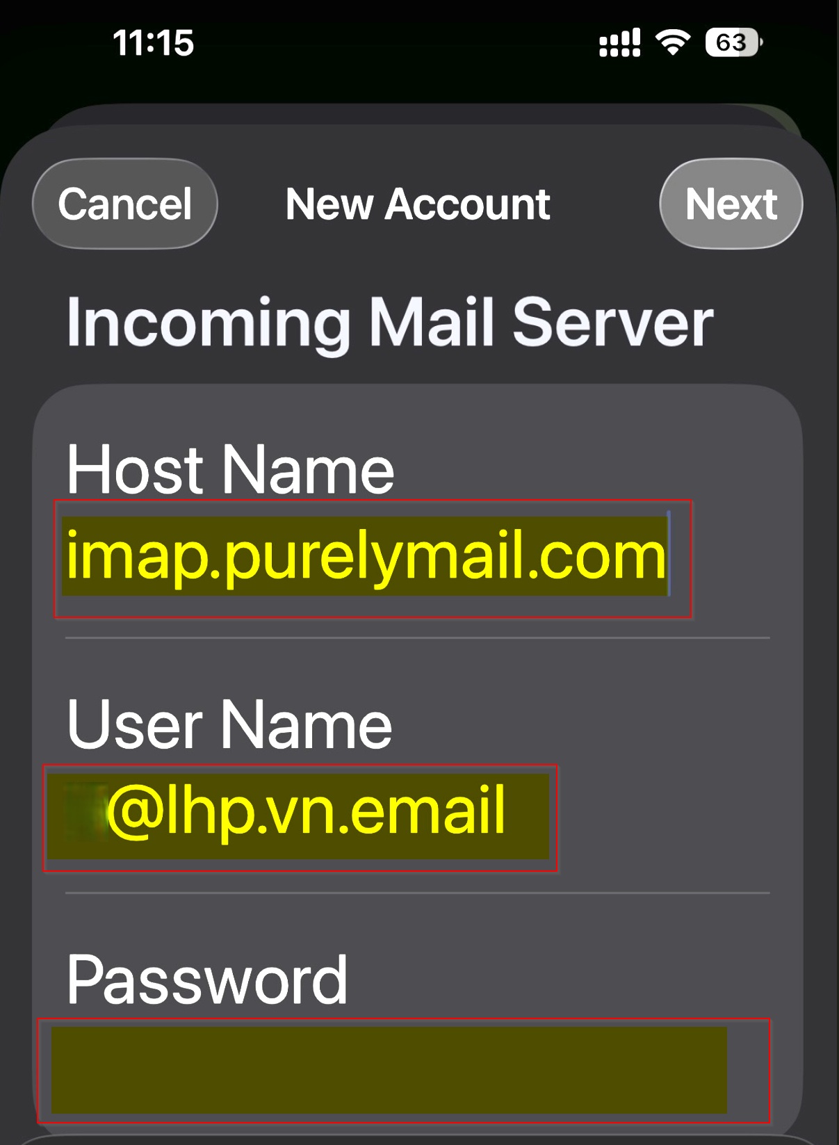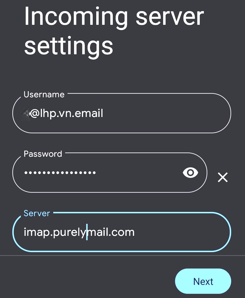 Bước 5: Nhập Incoming server là imap.purelymail.com, Username là địa chỉ email @lhp.vn.email, và Password của bạn